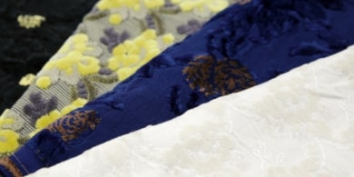 生地の特徴は、なんといっても美しい立体感と光沢、そしてなめらなか手触りです。カットパイルとループパイルを用いることで、凹凸のある美しいビロードの模様を織り出していきます。