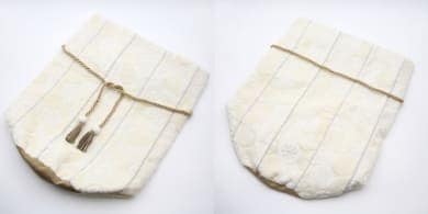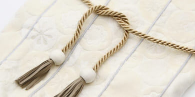 紐は、あらかじめ骨壷カバーに2箇所のループで取り付けてあるので、どなたでも簡単に結んでいただけます。カバーは折りたたんでお届けさせていただきます。