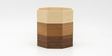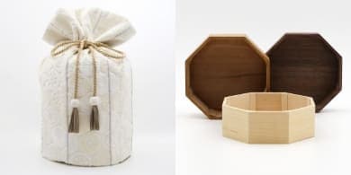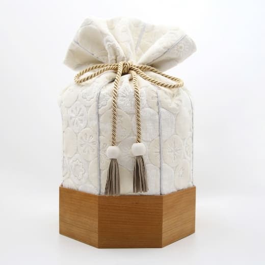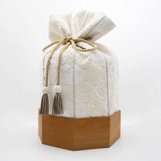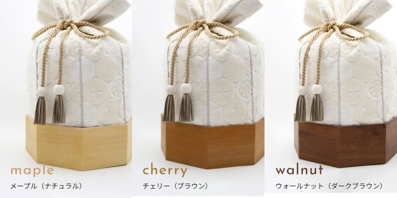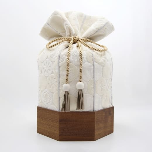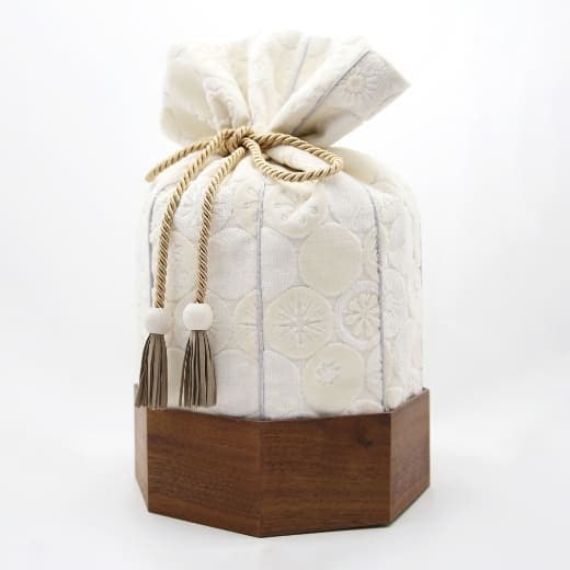 金華山織の風合いは木目とも大変相性が良いので「くるみ」専用の八角形の木桶をご用意しました。8つの方位に広がる八角形は、風水では邪気を払うともいわれ、科学的にも最も安定する図形といわれています。こちらの木桶をセットで使用することで骨壷の保護にもなります。