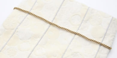 巾着袋の口を縛る紐には、光沢の強いレーヨン糸を使った、高級感のあるツイストコードを使用しました。ナチュラルな生地とも馴染むよう紐の色味にも配慮しています。