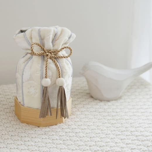 パイル織物の最高峰とも呼ばれる金華山織を贅沢に使った、骨壷カバーです。なめらかな手触りのパイル生地がやさしく骨壷を包み込みます。