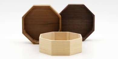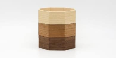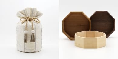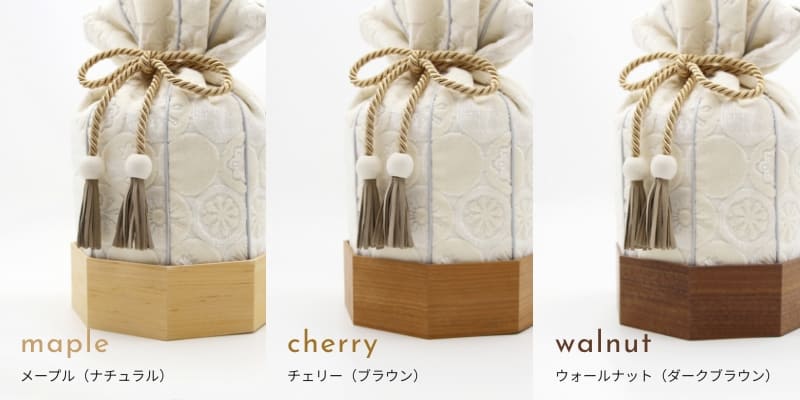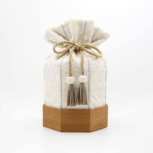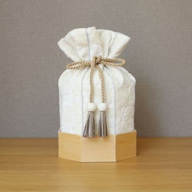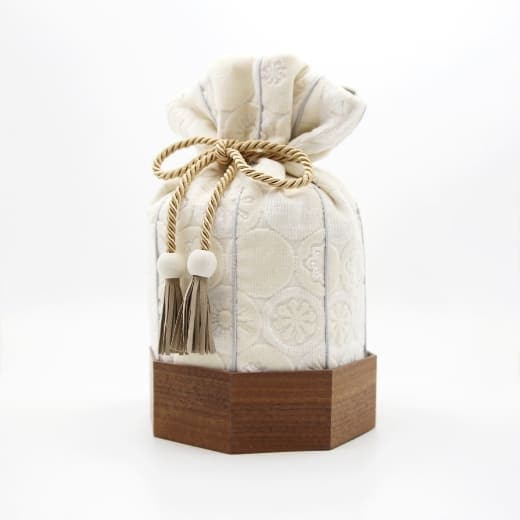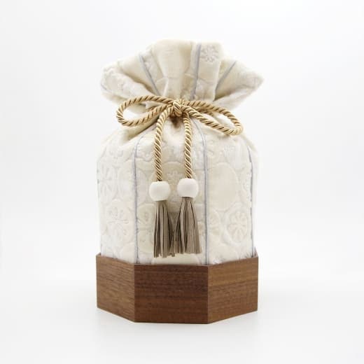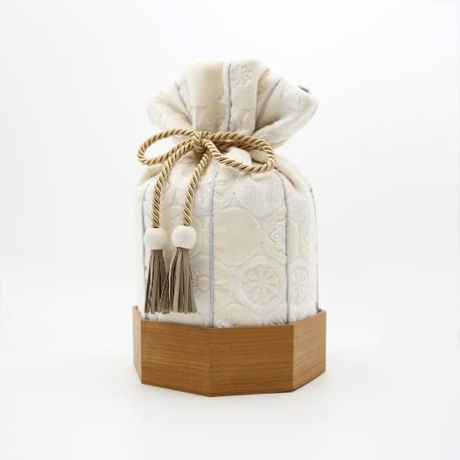 金華山織の風合いは木目とも大変相性が良いので「くるみ」専用の八角形の木桶をご用意しました。8つの方位に広がる八角形は、風水では邪気を払うともいわれ、科学的にも最も安定する図形といわれています。こちらの木桶をセットで使用することで骨壷の保護にもなります。