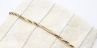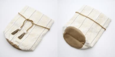 紐は、あらかじめ骨壷カバーに2箇所のループで取り付けてあるので、どなたでも簡単に結んでいただけます。カバーは折りたたんでお届けさせていただきます。