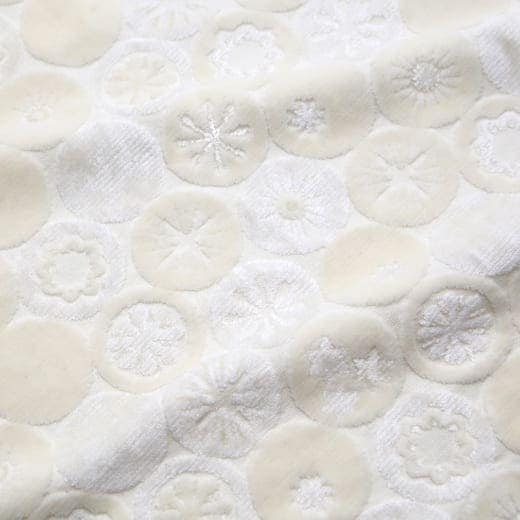 「くるみ フワラー柄 アイボリー」は、色味の異なる格子に並んだ丸いパイル生地のなかに、花のモチーフが織られたやわらかいデザインです。この可愛らしい柄は、金華山織の特徴である美しい凹凸で表現されています。